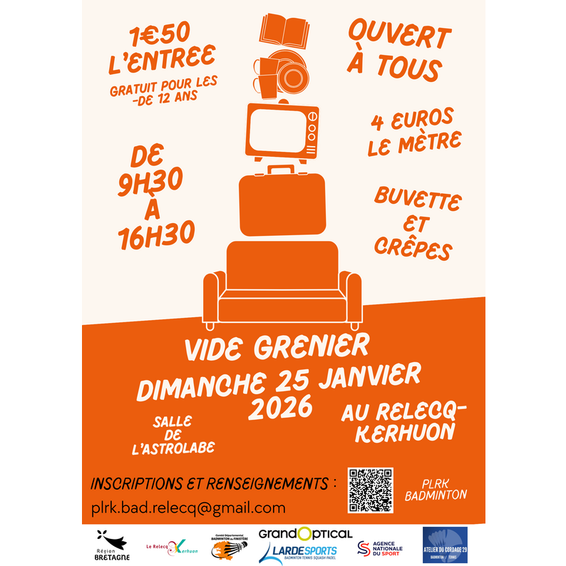 Vide grenier à la salle de l'astrolabe du relecq-kerhuon, le dimanche 25 janvier de 9h30 à 16h30. Entrée à 1€50 (gratuit pour les moins de 12 ans). Buvette sur place (boissons, crêpes, sandwichs).