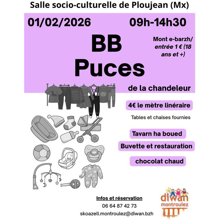Bébé puces de la chandeleur organisé par diwan montroulez: vêtements 0 - 16 ans, jouets et articles de puériculture.