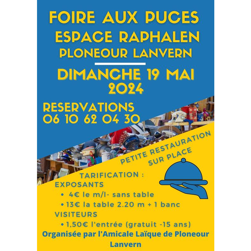 Foire aux puces avec restauration sur place : frites, saucisses, paninis, crêpes, kouign, buvette.
