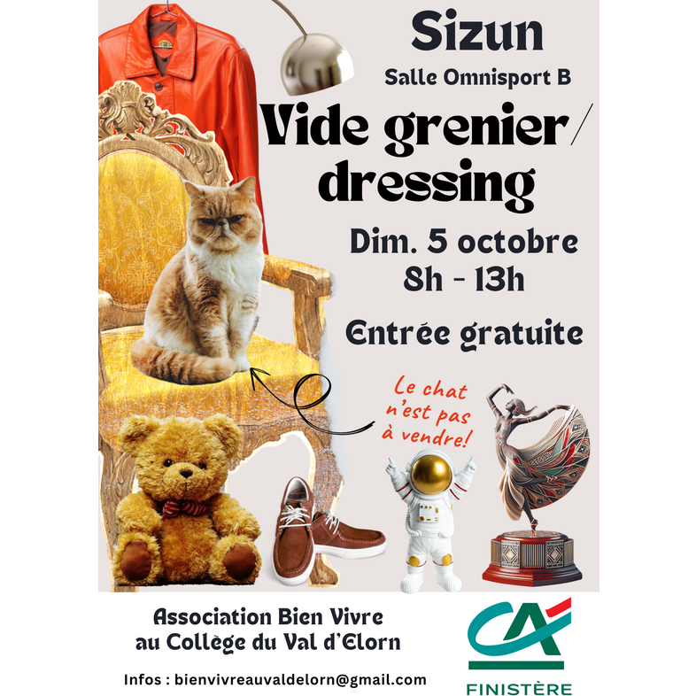 Le vide grenier/dressing est organisé par l’association bien vivre au collège du val d’elorn de sizun, le dimanche 5 octobre 2025 de 8h à 13h. Dans la salle omnisport b de sizun.