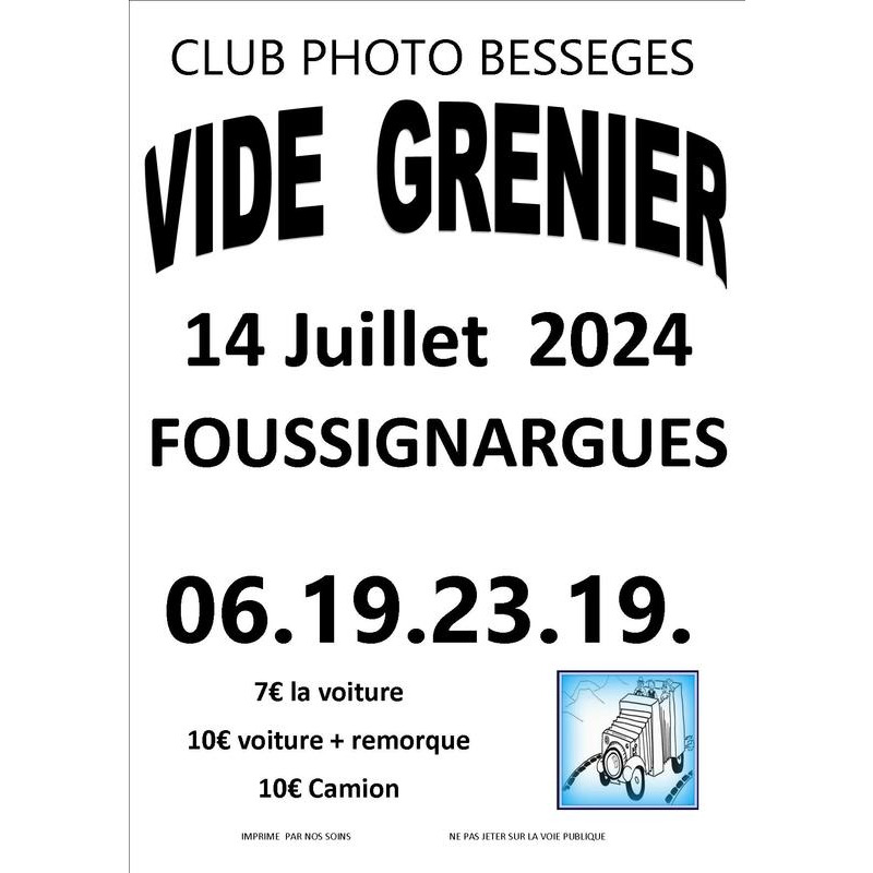 Le club photos de bessèges organise son grand vide grenier toute la journée de 7 h a 19 h a foussignargues parc frizon et situé à 5 minutes de bessèges . Site ombragé ,jeux pour les enfants venait chinée et faire de belles affaires environ 50 stands de particuliers sont attendus . Une buvette et petite restauration sont disponibles sur place.