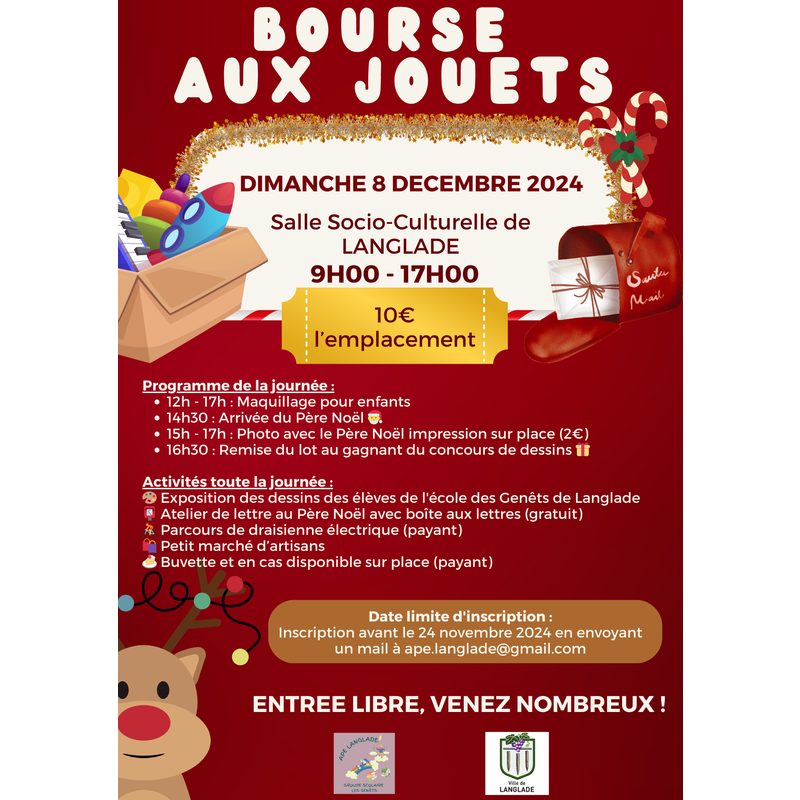 Marquez vos calendriers! Le dimanche 8 décembre de 9h à 17h, c’est le grand jour de la bourse aux jouets et du marché de noel organisée par l’ape à la salle socio-culturelle de langlade.