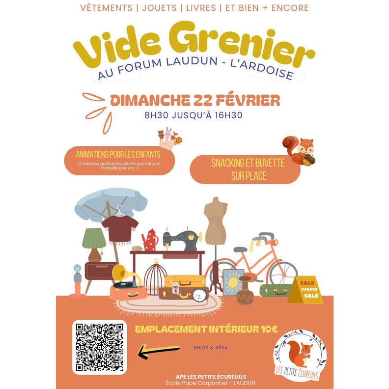 4ème édition du vide-grenier de l'ape les petits écureuils quand ? Le dimanche 22 février horaires : de 8h30 à 16h30 où ? Au forum de laudun, route de saint-laurent-des-arbres 30290 laudun l’ardoise l'association des parents d'élèves de l’école pape carpantier de laudun est ravie de vous inviter à son vide grenier annuel, une belle occasion de faire de bonnes affaires et de soutenir les projets scolaires ! Au programme : des stands riches en trouvailles : jouets, livres, vêtements, objets déco, et bien plus encore ! Snacking et buvette sur place pour une pause gourmande activités pour les enfants (château gonflable, pêche aux canards ...)