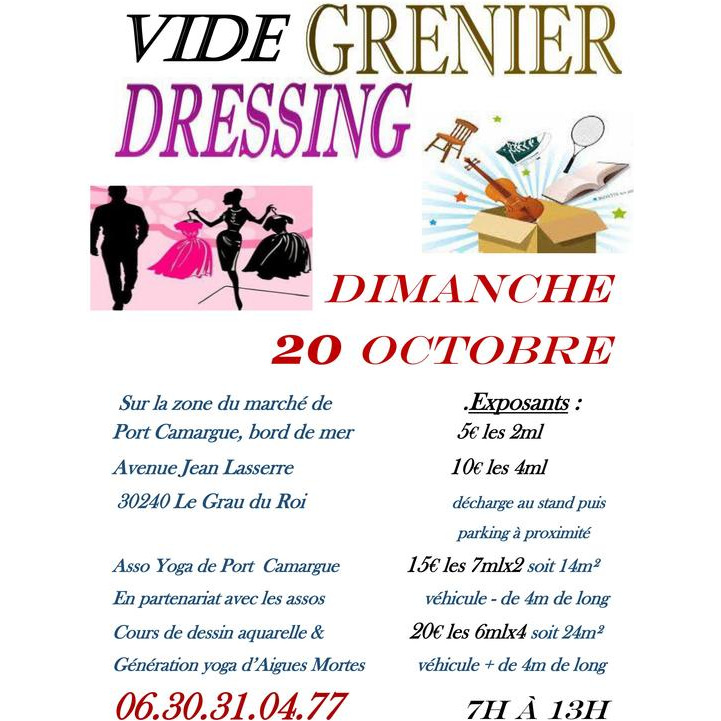 Les visiteurs peuvent arriver à partir de 8h. Le vide grenier se termine à 13h. Plusieurs parkings gratuits à côté du forum et de l’immeuble la goélette. Se situe sur la promenade de bord de mer, sur les places du marché, près de la plage. A proximité : 2 wc publics, restauration, café, rafraichissements. Organisé par les associations yoga/pilâtes de port camargue, cours de dessin – aquarelle de port camargue et aigues mortes et générations yoga d'aigues mortes.