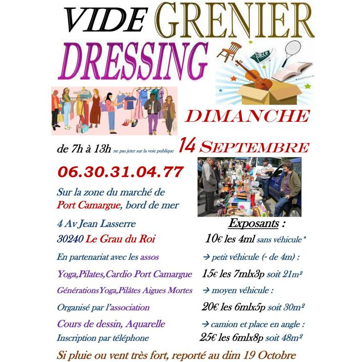 Le vide grenier se situe sur la promenade de bord de mer, sur les places du marché de port camargue, près de la plage. Plusieurs stationnements gratuits sur le forum près de l’immeuble la goélette. A proximité : 2 wc publics, restauration, café, rafraichissements, terrain jeux pour enfants. Organisé par les associations yoga pilâtes cardio de port camargue, cours de dessin – aquarelle de port camargue et aigues mortes et générations yoga d'aigues mortes.