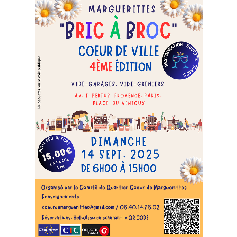 Vide-greniers, vide-garages organisé dans le centre historique de marguerittes. Buvettes / restauration / glaces / toilettes.