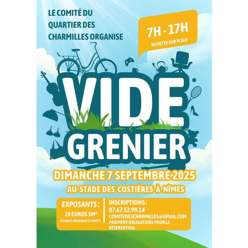 Modalités du vide-grenier 10 euros 5m2 paiement : la réservation sera validée uniquement après règlement par chèque (chèque à l’ordre du comité des charmilles) ou espèces. Nous vous indiquerons les informations par mail. Merci de préciser sur votre paiement vos nom, prénom, numéro de téléphone et adresse e-mail. Installation : vous pourrez vous installer à partir de 7h au stade des costières. L’équipe d’organisation sera présente sur place pour vous accueillir et vous placer. Le comité des charmilles nîmes.