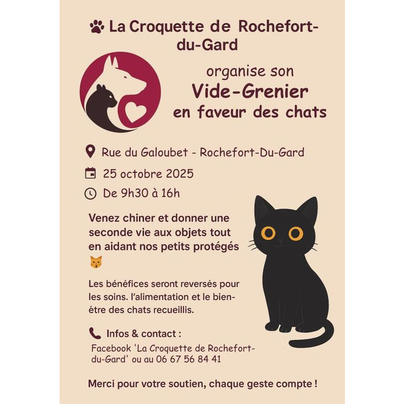 Vide grenier solidaire réalisé par l'association "la croquette de rochefort-du-gard". Nous exposons les dons de nos généreux donateurs. Tous les bénéfices seront reversés pour les soins et le bien-être des chats recueillis.