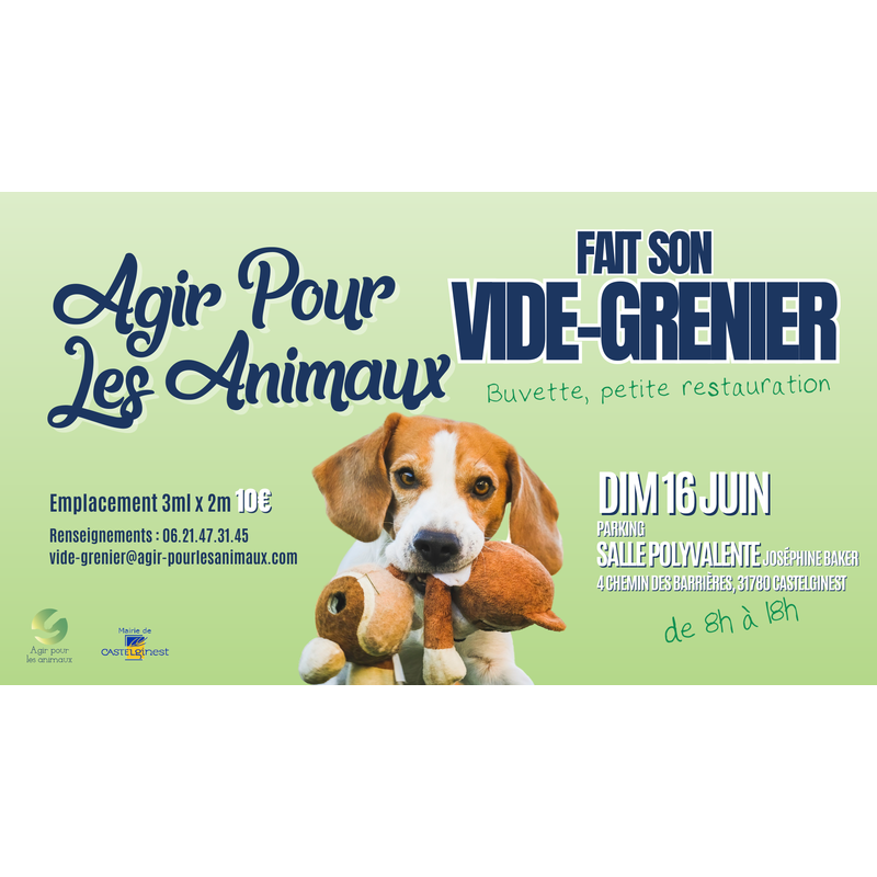 Notre vide grenier au profit du refuge est de retour cette année encore! Rendez-vous à l'extérieur de la salle polyvalente joséphine baker à castelginest 31780, au 4 chemin des barrières, toute la journée. Ouverture dès 8h (exposants dès 5h).