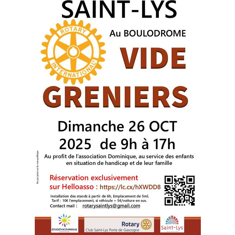 le rotary club de saint-lys porte de gascogne en partenariat et pour l'association dominique, vous donne rendez-vous le dimanche 26 octobre 2025 au boulodrome de saint-lys pour une journée conviviale placée sous le signe du partage. Venez en famille chiner, flâner entre les stands, dénicher des objets insolites ou utiles, et soutenir les actions locales du club.