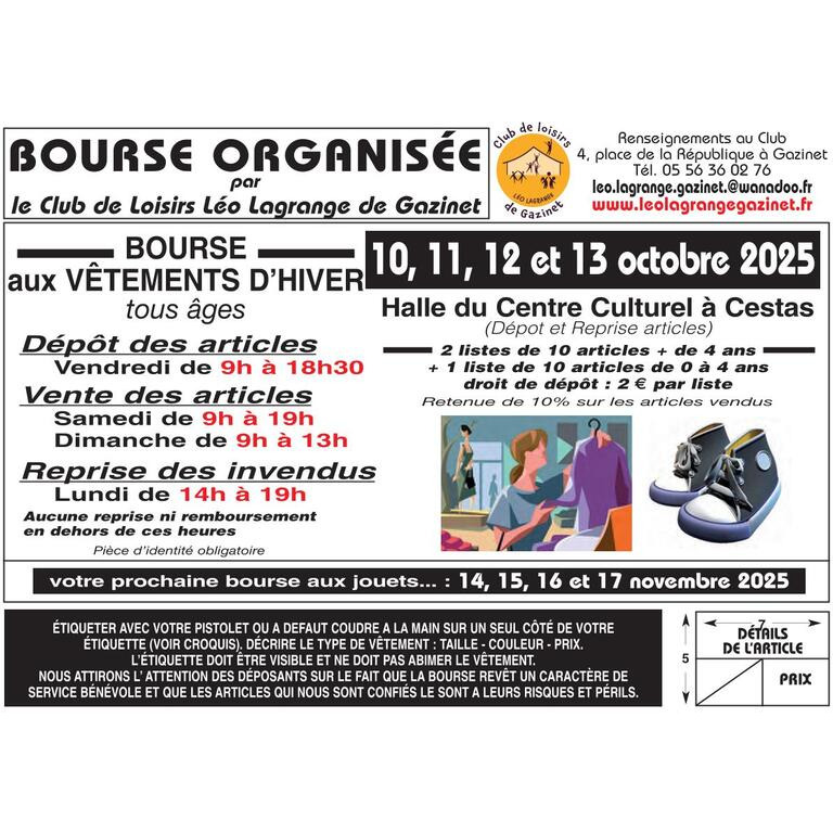Cet événement organisé par le club de loisirs leo lagrange de gazinet: les particuliers déposent leurs vêtements en bon état, l’association se charge de les mettre en vente au tarif choisit par le déposant, puis reverse le produit de la vente aux déposants, en conservant une petite commission pour couvrir ses frais.