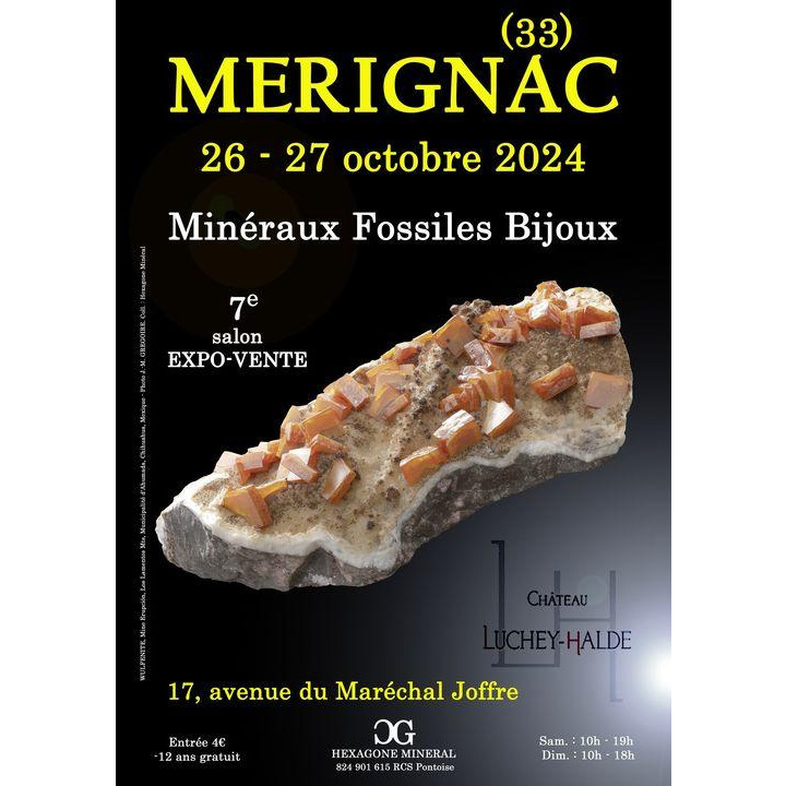 Hexagone mineral vous donne rendez-vous les 26 et 27 octobre 2024 pour le 7e salon minéraux fossiles et bijoux de mérignac (gironde). Cet événement se déroulera au château luchey-halde situé 17, avenue du maréchal joffre. Pour animer ce salon, de nombreux exposants professionnels ou amateurs présenteront au public leurs dernières nouveautés en provenance du monde entier mais aussi des quatre coins de france. Comme dans tous nos salons, un très large choix de minéraux, fossiles et bijoux sera proposé à la vente pour le plus grand bonheur des petits et des grands. Pour répondre toujours plus aux attentes du public, un service d'expertise gratuite sera aussi proposée par les organisateurs à celles et ceux qui souhaitent faire déterminer leurs découvertes minéralogiques ou paléontologiques. Ce rendez-vous incontournable de l'agglomération bordelaise devrait réunir de très nombreux passionnés de la région. Nous mettons tout en œuvre pour que ce week-end remplisse d'émerveillement les passionnés tout en sensibilisant les néophytes et les plus jeunes !