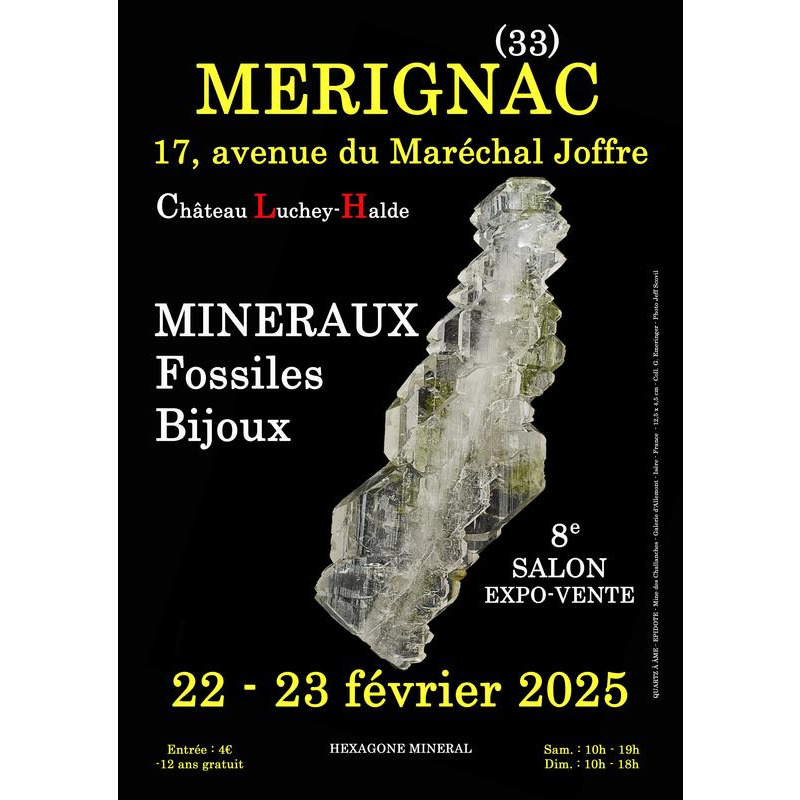Hexagone mineral vous donne rendez-vous les 22 et 23 février 2025 pour le 8e salon minéraux fossiles et bijoux de mérignac (gironde). Cet événement se déroulera au château luchey-halde situé 17, avenue du maréchal joffre. Pour animer ce salon, entre 15 et 20 exposants professionnels ou amateurs présenteront au public leurs dernières nouveautés en provenance du monde entier mais aussi des quatre coins de france. Comme dans tous nos salons, un très large choix de minéraux, fossiles et bijoux sera proposé à la vente pour le plus grand bonheur des petits et des grands. Pour répondre toujours plus aux attentes du public, un service d'expertise gratuite sera aussi proposée par l'organisateur à celles et ceux qui souhaitent faire déterminer leurs découvertes minéralogiques ou paléontologiques. Ce rendez-vous incontournable de l'agglomération bordelaise devrait réunir de très nombreux passionnés de la région. Nous mettons tout en œuvre pour que ce week-end remplisse d'émerveillement les passionnés tout en sensibilisant les néophytes et les plus jeunes !