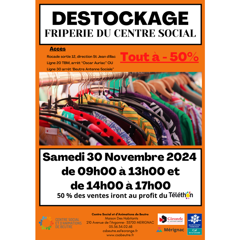 Vente de vêtements/chaussures/accessoires d’occasion de 9h00 à 13h00 et de 14h00 à 117h00.Tous les articles seront à -50%.