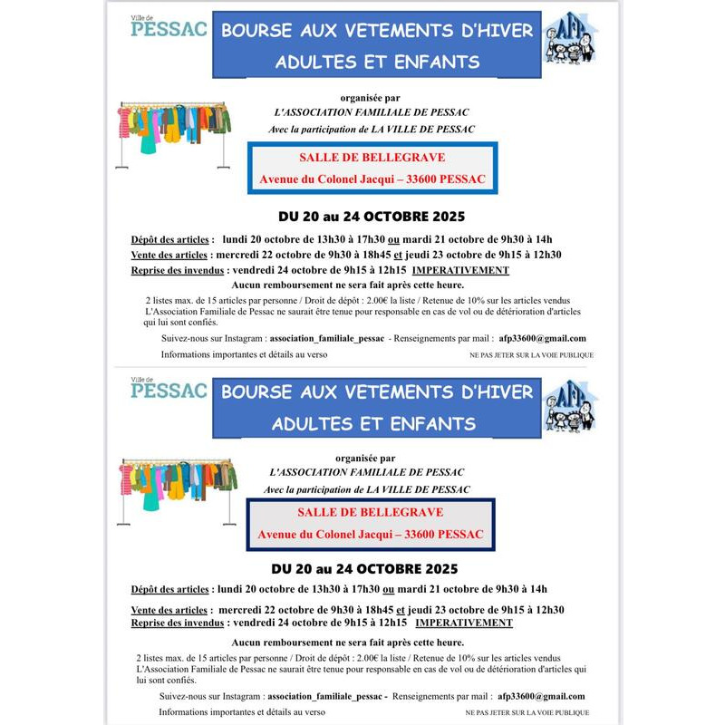 Vente des articles : mercredi 22 octobre de 9h30 à 18h45 et jeudi 23 octobre de 9h15 à 12h30.