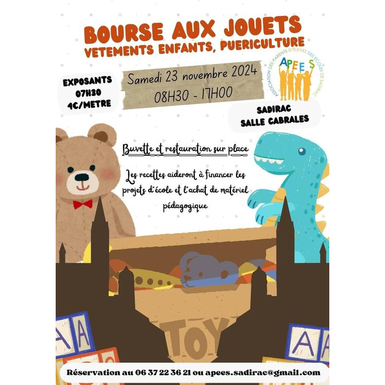 L'association des parents d'élèves de sadirac organise une bourse aux jouets, vêtements enfants et puériculture.