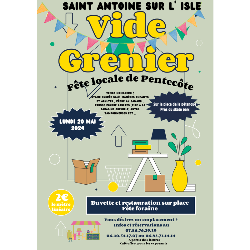 Vide grenier lundi de pentecôte , sur la place des sports , buvette sur place café offert , parking , fête foraine sur le site , food truck , manège .