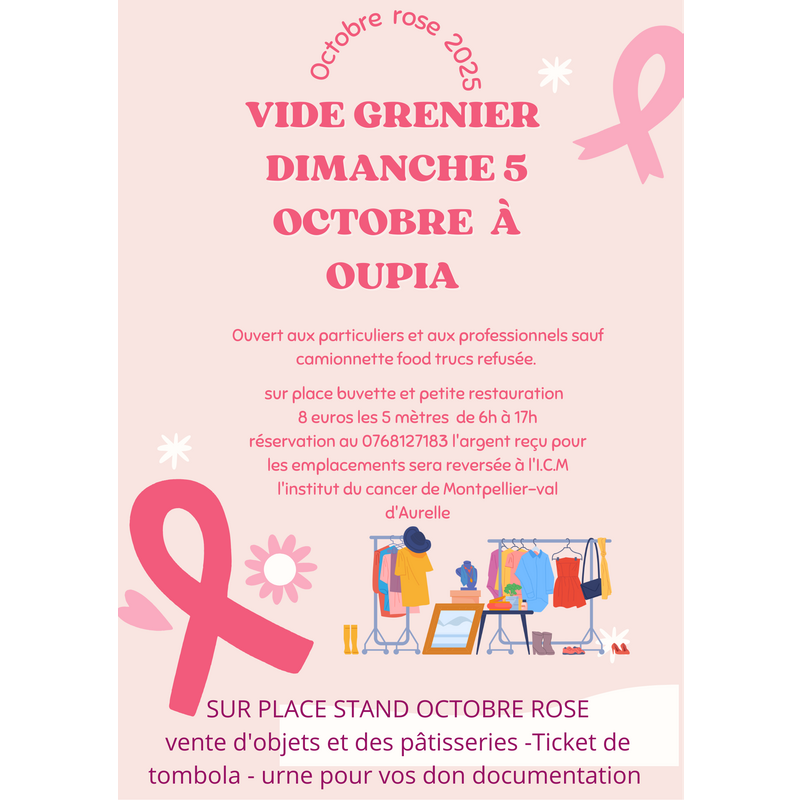 La serre pètanque de oupia organise un vide grenier pour octobre rose l argent des emplacements seront reversés au chu val d'aurelle de montpellier.Merci de venir nombreux