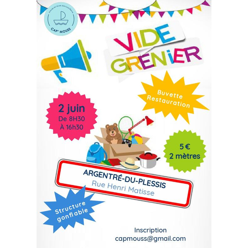 L'amicale cap'mouss de l'école jean louis etienne organise son vide-grenier à argentré-du-plessis le dimanche 2 juin 2024, avenue henri matisse.