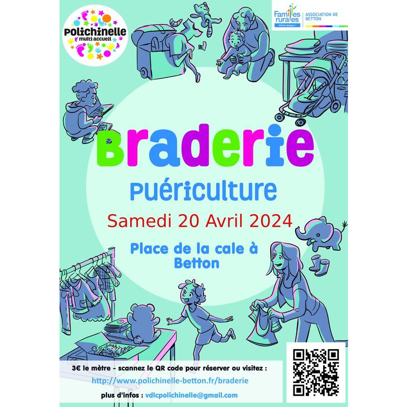 La crèche polichinelle de betton vous donne rendez-vous le samedi 20 avril 2024 pour une nouvelle édition de sa braderie puériculture. Nous accueillons plus d’une centaine d’exposants, uniquement des particuliers, qui tiennent près de 600m de stands. Matériels de puériculture, vêtements enfants, jeux, jouets, livres…venez faire de la place dans vos placards !