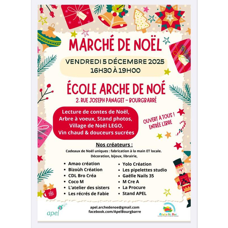 L'apel l'arche de noé organise son marché de noël le vendredi 5 décembre de 16h30 à 19h.