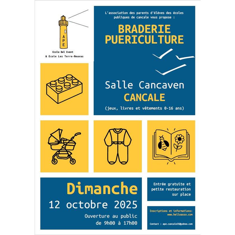 L'ape organise une braderie puériculture (jeux, livres et vêtements 0-16 ans) le dimanche 12 octobre prochain à la salle cancaven rue d'arnstein 35260 cancale.