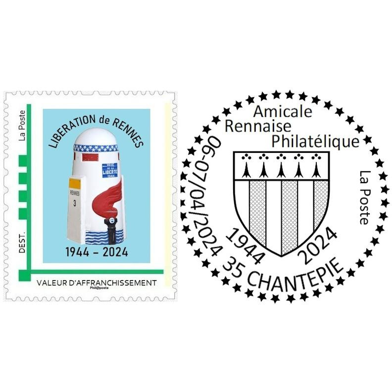 Championnat régional de philatélie - exposition philatélique - bureau postal temporaire - vente timbre personnalisé 80 ans de la libération de rennes avec borne de la voie de la liberté - vente souvenirs philatéliques.