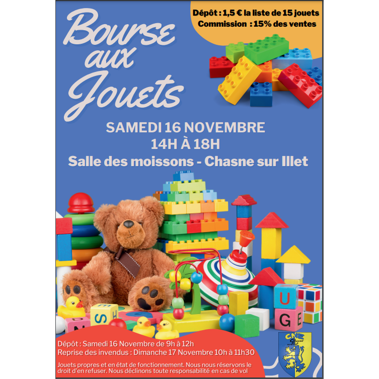 Samedi 16 novembre : 9h-12h dépôt des jouets. 1,50€ la liste de 15 + 15% de commission environ