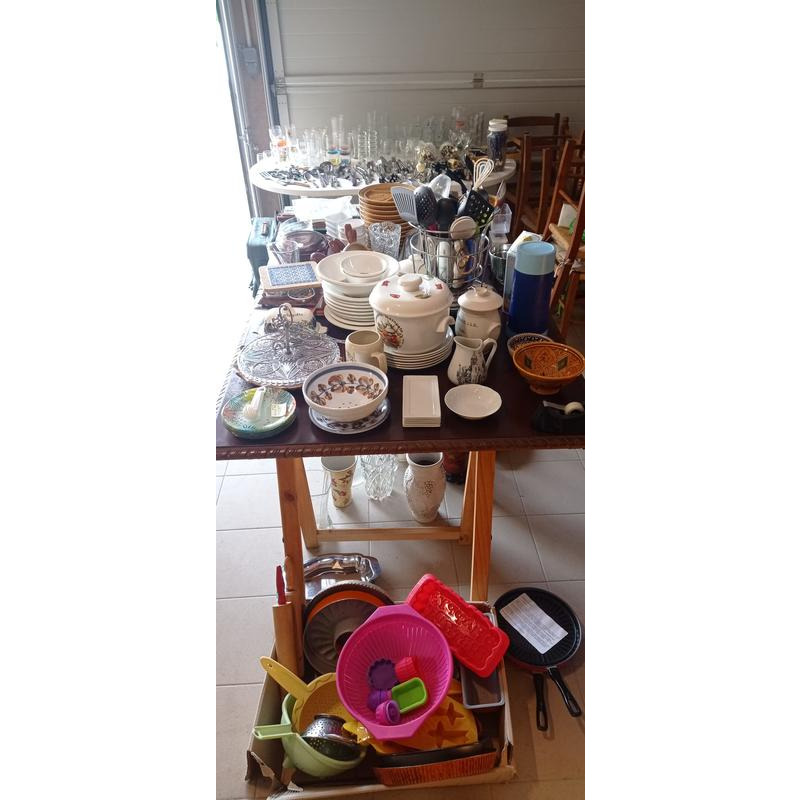 Vaiselle, petit mobilier, outils de jardin, linge de maison, objets de décoration, petit electro-ménager (raclette, grill, etc..), vinyles, dvd, vhs, etc..