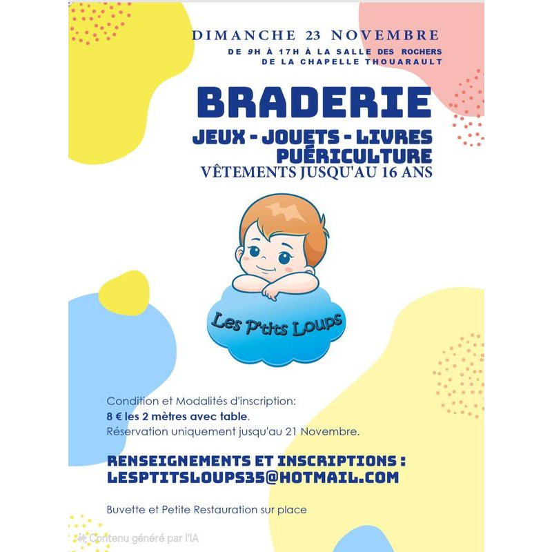 Braderie jeux jouets livres matériel de puériculture et vêtements jusqu'au 16 ans.