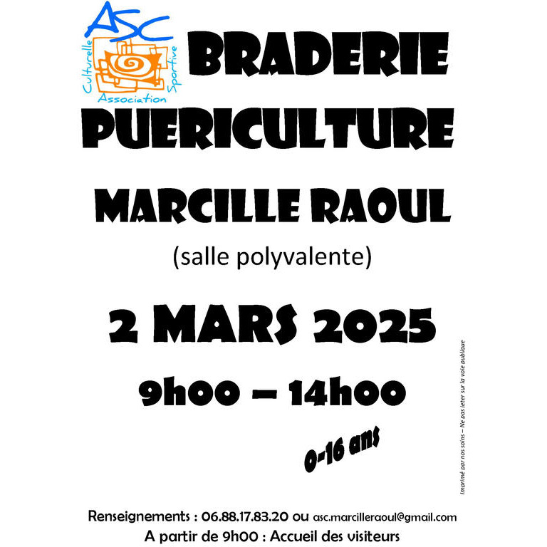 Braderie puériculture (0-16 ans) organisée par l'asc marcillé raoul de 9h00 à 14h00 à la salle polyvalente.