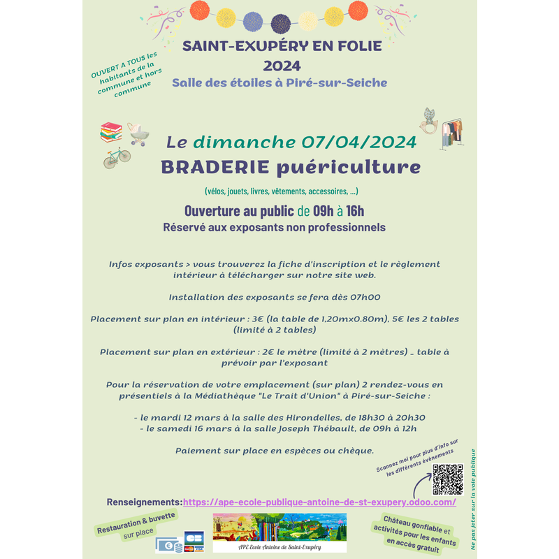 L'ape antoine de st exupéry organise cette braderie dont les bénéfices financeront les projets de l'école publique antoine de st exupéry.