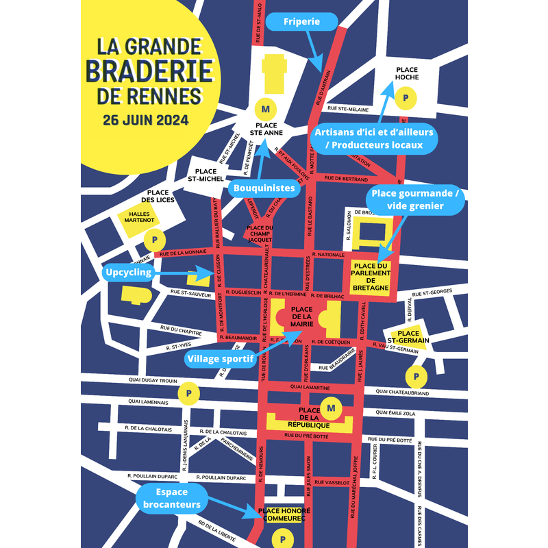 Venez vous joindre à nous pour la grande braderie de rennes ! Les nombreux commerçants seront présents devant leurs vitrines lors de la deuxième plus grande braderie de france, attirant plus de 300 000 visiteurs. Cette année, en plus des espaces habituels tels que le village sportif sur la place de la mairie, l'espace foodtruck sur la place du parlement, l'espace upcycling sur la place saint-sauveur, les brocanteurs sur la place honoré commeurec et les bouquinistes sur la place saint-anne, nous avons le plaisir d'inaugurer deux nouveaux espaces : la friperie rue d'antrain et les artisans ainsi que les producteurs locaux sur la place hoche ! Alors on se dit au 26 juin ?