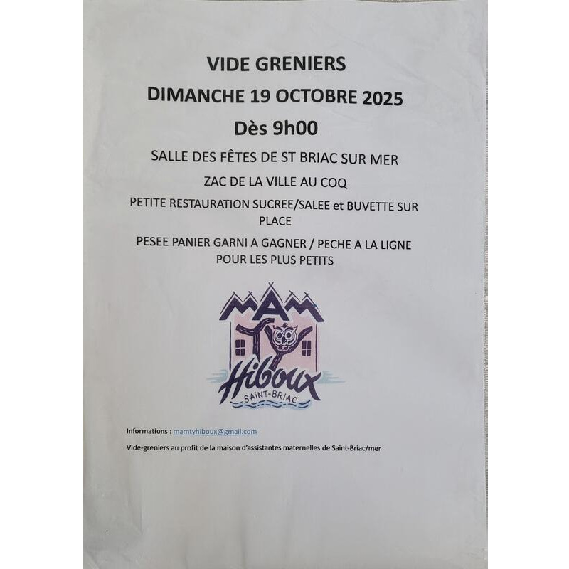 La mam ty hiboux organise son deuxième vide greniers de l’année en date du dimanche 20 octobre 2024 à la salle des fêtes, zac de la ville au coq, de saint briac sur mer. L’entrée au public sera ouverte de 9h à 17h. Nous serons heureuses de vous y accueillir.