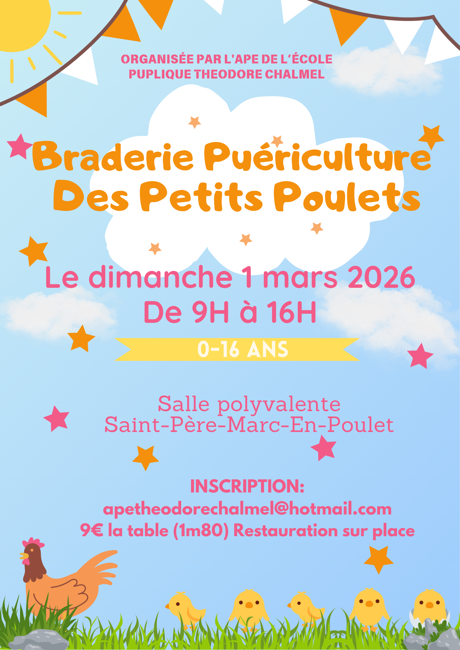 Braderie puériculture 0-16 ans de 9h à 16h, restauration sur place
