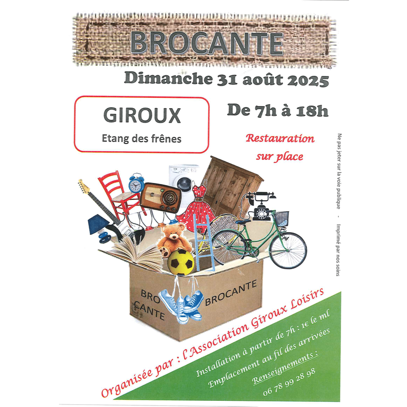 L'association giroux loisirs organise sa brocante annuelle à l'étang des frênes le dimanche 31 août 2025 de 7h à 18h. Restauration sur place.