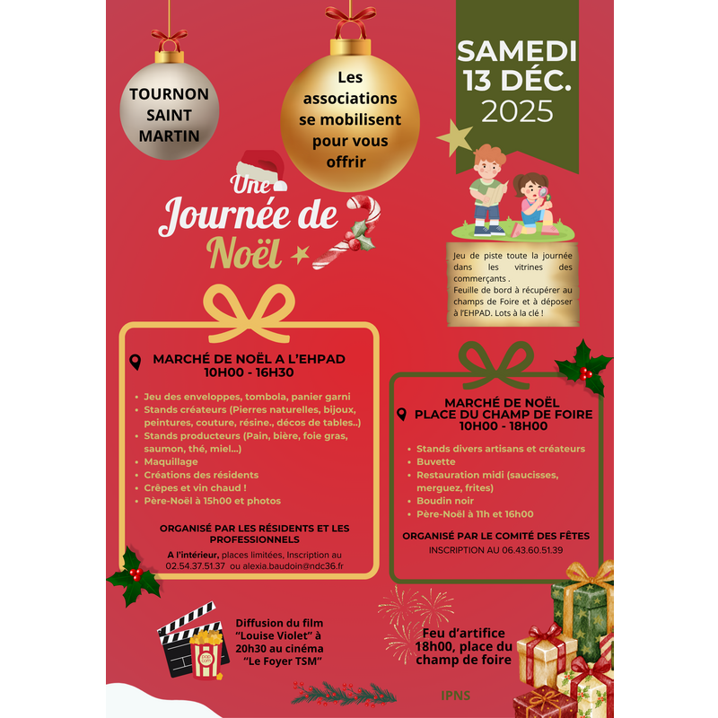 - marché de noël organisé par l'ehpad, à l'intérieur de 10h00 à 16h30 et un marché de noël organisé par le comité des fêtes à l'abris, à l'ancienne caserne des pompiers de 10h00 à 18h00 inscription obligatoire auprès de kévin (contacts sur l'affiche)