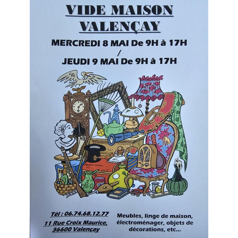 Vide maison avec 4 lits, 2 armoires, 3 commodes, 2 canapés avec fauteuils, 4 tables chevets, linge de lit, linge de toilette, nappes, nombreux rideaux au mètre, vaisselle, dvd, cd, livres, 2 réfrigérateurs, 2 micro-ondes, tableaux, vêtements....