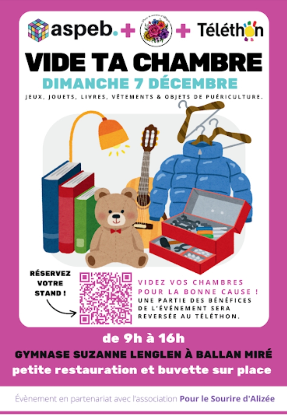 "Vide ta chambre" le dimanche 7 décembre 9h-16h au Gymnase Suzanne Lenglen à Ballan Miré! C'est l'occasion parfaite pour acheter jouets, vêtements et accessoires pour vos enfants .