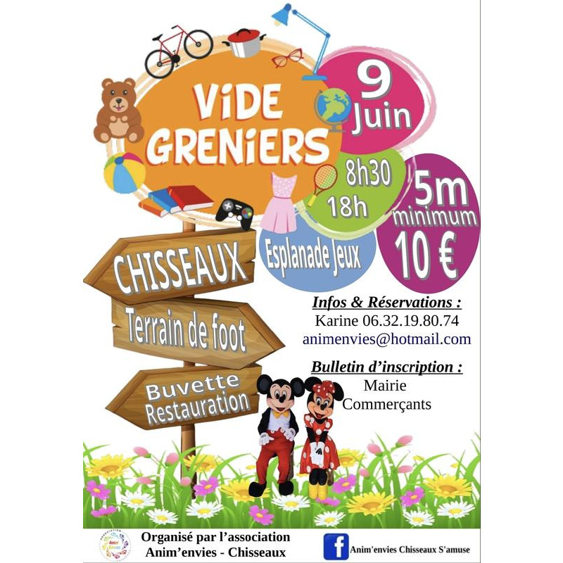 2ème édition du vide greniers de chisseaux, dans un cadre agréable au bord du cher, buvette, restauration, esplanade de jeux accessible à tous avec la présence de mickey et minnie et bien d'autres surprises à venir.