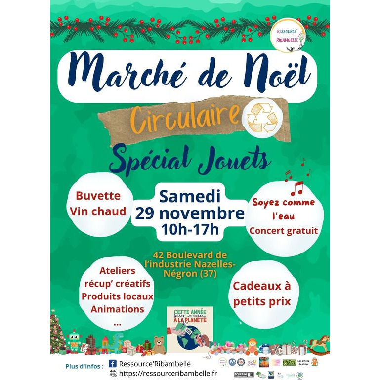 C'est maintenant une tradition pour la ressourcerie d'organiser son fameux marché de noël circulaire !! L'occasion de rappeler qu'au moment des fêtes aussi, d'autres gestes sont possibles pour préserver notre environnement : acheter des objets d'occasion à offrir, se tourner vers les produits locaux, faire ses achats de noël dans la bonne humeur en allant à la rencontre des acteurs de votre territoire !! Au programme cette année : de 10h à 17h : - retrouvez notre sélection d'objets d'occasion à offrir, et notamment de jouets grâce à notre collecte organisée auprès des écoles du val d'amboise ! - stands d'artisans et produits locaux, animations ! - buvette et vin chaud ! A 11h et à 15h : - des ateliers de récup' créatifs (gratuits et sur inscription à la ressourcerie ou à ) : bulbes de noël le matin, fabrication de décos de noël récup' l'après-midi - un concert gratuit avec soyez comme l'eau à 15h30 ! On espère vous retrouver aussi nombreux-ses que les années précédentes pour cette journée chaleureuse, placée sous le signe d’un noël respectueux de l'environnement !! A bientôt à la ressourcerie