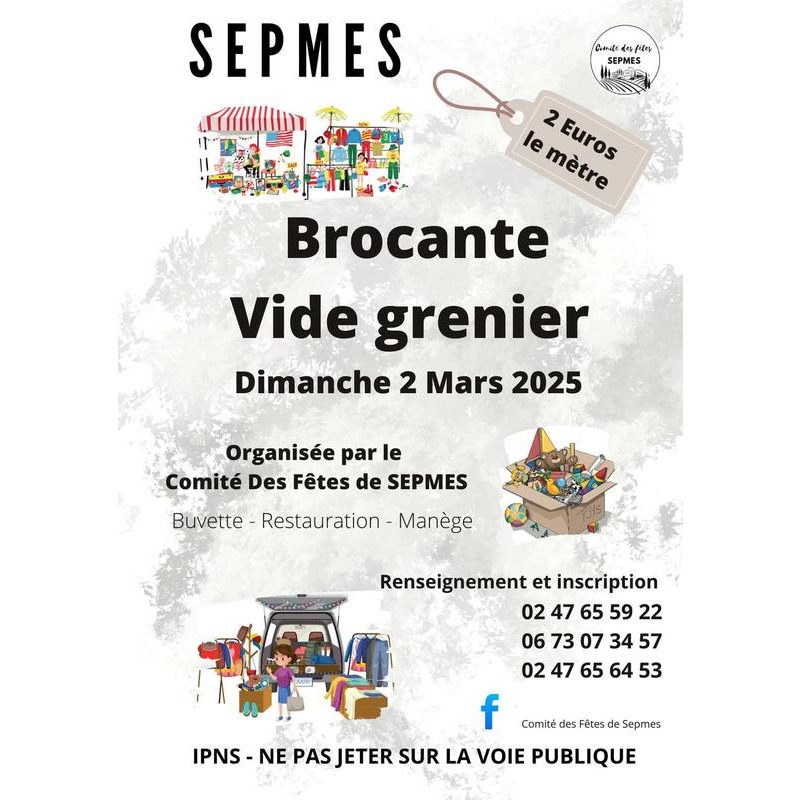 brocante vide grenier organisé par le comité des fêtes de sepmes. La brocante se situe dans la rue principale et ses rues attenantes. Vous retrouverez sur place une buvette restauration et manège.