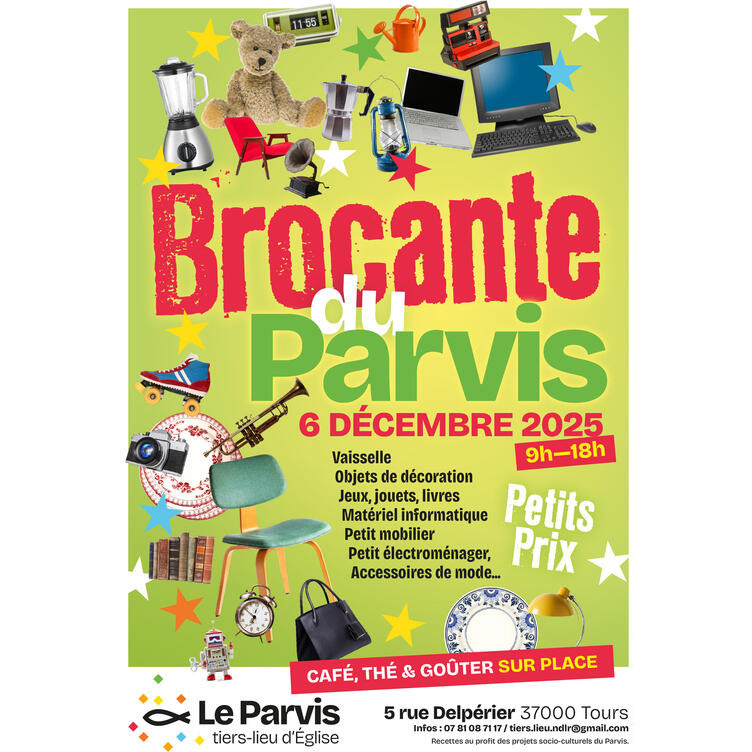 Le parvis, tiers-lieu d'église, organise sa 1ere brocante de noël : vaisselle, objets anciens, accessoires de mode vintage, objet déco, jeux, jouets, vêtements enfants, livres etc...Le tout à petits prix. Café, thé, chocolat chauds et gouters en vente sur place au café associatif.