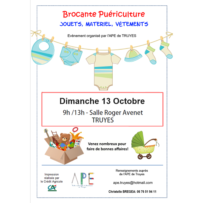 L’association des parents d’élèves de truyes (ape) organise une nouvelle édition de la brocante puériculture, jouets, matériels, vêtements, action au profil des écoles de la commune. Retrouvez nous, dimanche 13 octobre 2024, de 9h à 13h, sur notre brocante d'une trentaine d'exposants. Sur place buvette, vente de gâteaux et crêpes.