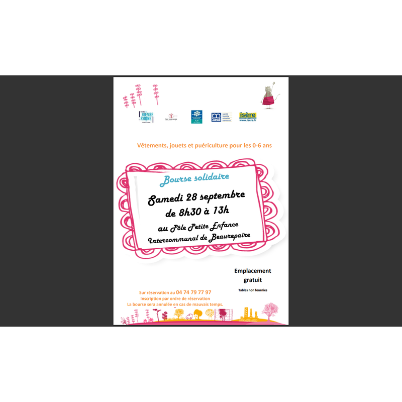 Bourse solidaire, puériculture, jouets, vêtements 0/6ans. La bourse sera annulée en cas de mauvais temps.