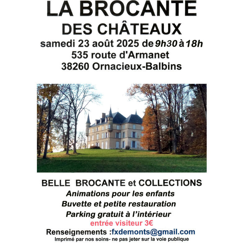 Brocante composèe de professionnels et d'amateurs . Avec également artisans crèateurs et bouquinistes . Animation pour enfants . Boissons et petite restauration . Au sein d'un domaine familial privé . Parking gratuit à l'intérieur .