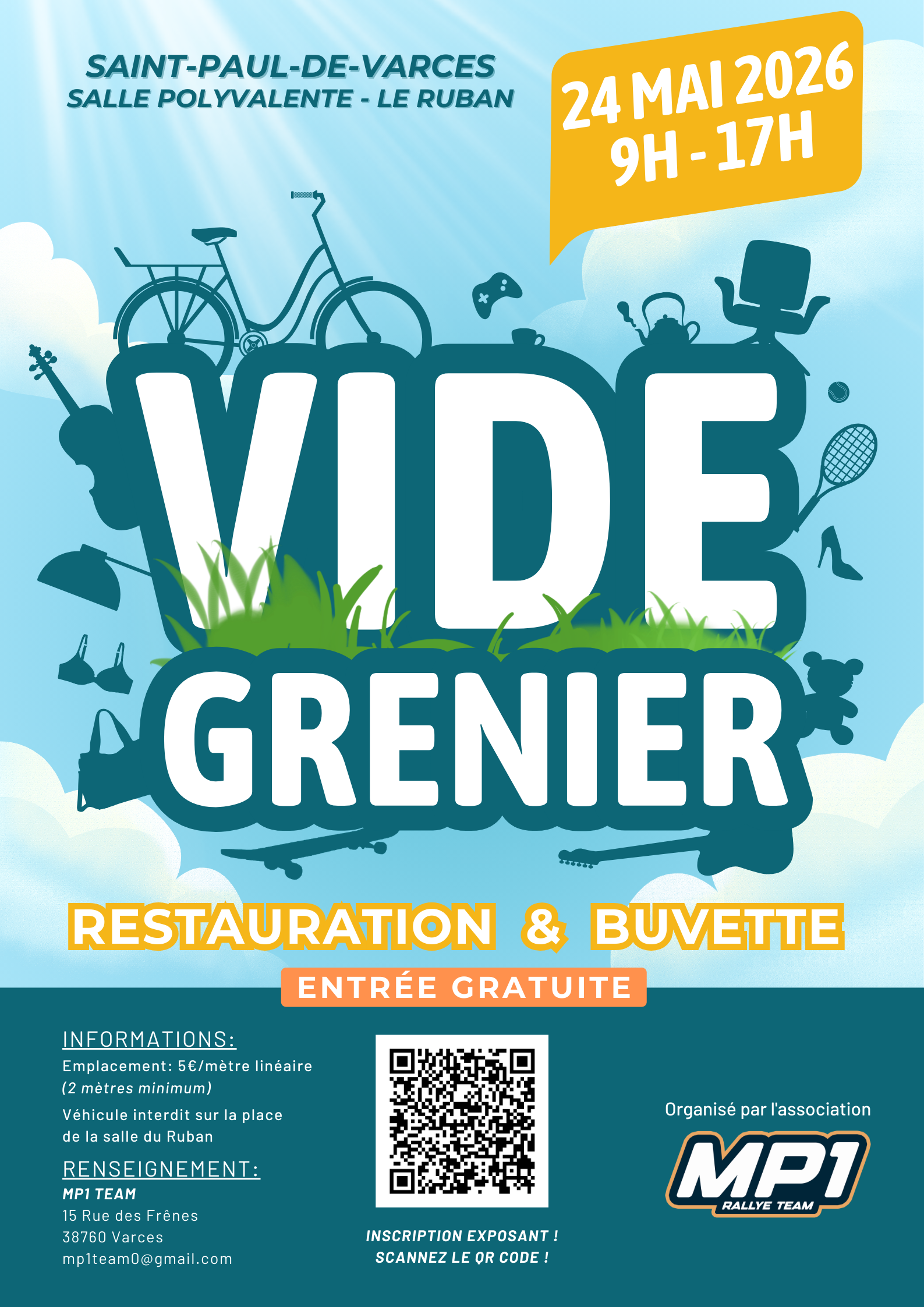 L'association MP1 TEAM organise son vide grenier le dimanche 24 Mai 2026 à la salle Le Ruban de Saint Paul de Varces.