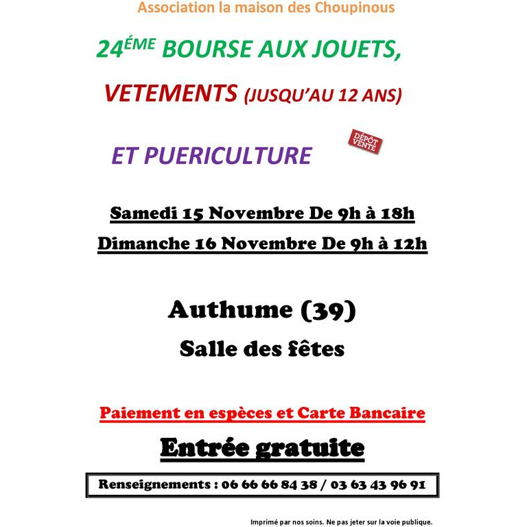 Vente de jeux, jouets, vêtements jusqu'au 12 ans et articles de puériculture d'occasion. Tout est classé par catégorie et âge. 60 exposants (complets). Nous fonctionnons en dépôt vente