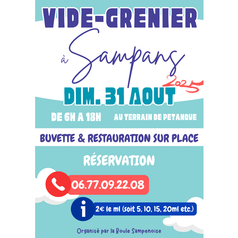 L'association "la boule sampenoise" organise pour la cinquième fois consécutive son vide grenier à sampans au terrain de pétanque (rue de l'étang) le dimanche 31 août 2025 de 6h à 18h.