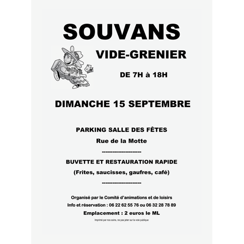 Vide grenier dans l'enceinte de la salle des fêtes et rue de la motte, toilettes, restauration rapide : saucisses, frites, gaufres, café,buvette.